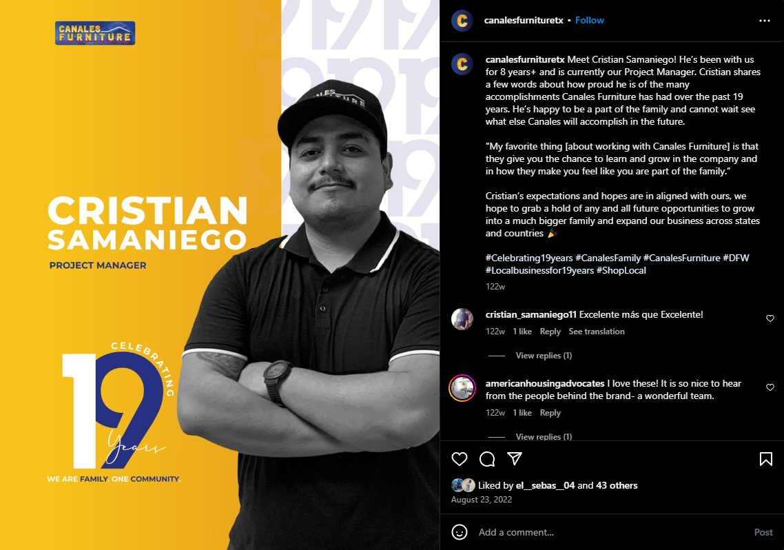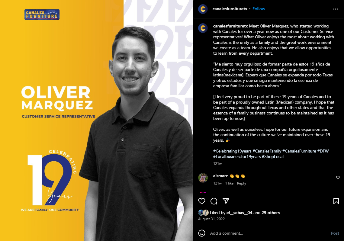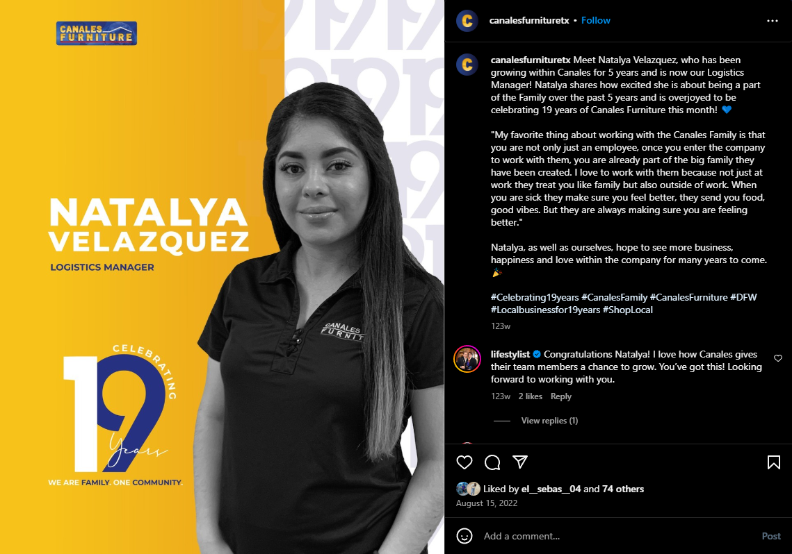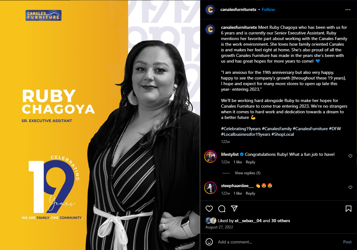 Canales Furniture is a family-owned furniture business that sells furniture, mattresses, appliances, and home decor. The company was founded in 2003 by Silvia Veronica Canales and her siblings, who began by selling furniture door to door. Today, Canales Furniture has 19 licensed stores in North Texas and Oklahoma.